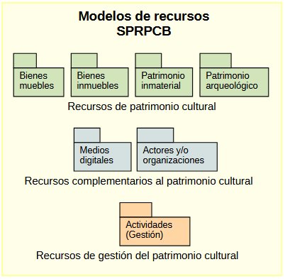 - Recurso patrimonial, Modelo central que describe los bienes patrimoniales, que se caracterizan según el tipo, por ejemplo: inmuebles, muebles, monumentos arqueológicos e inmaterial